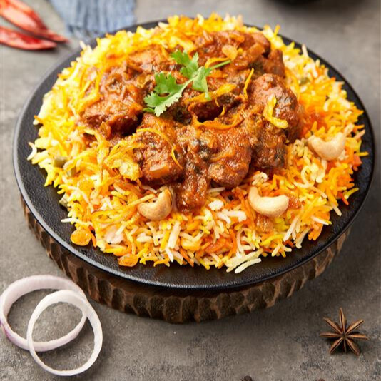 Aromatic basmati rice with spicy Chicken 65 and bold biryani spices.